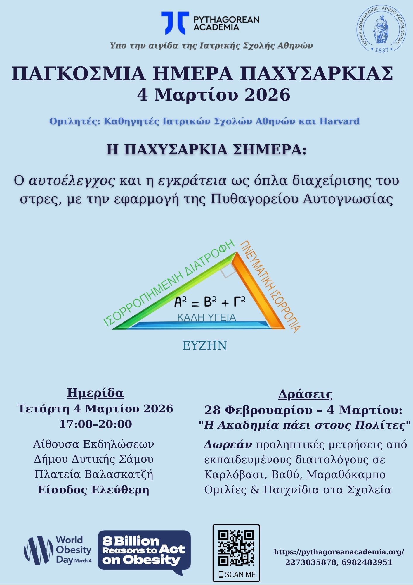 Η Πυθαγόρειος Ακαδημία, διοργανώνει στη Σάμο σειρά δράσεων ενημέρωσης και ευαισθητοποίησης από τις 28 Φεβρουαρίου έως και τις 4 Μαρτίου, με αφορμή την Παγκόσμια Ημέρα Παχυσαρκίας. Κεντρικό γεγονός αποτελεί η…