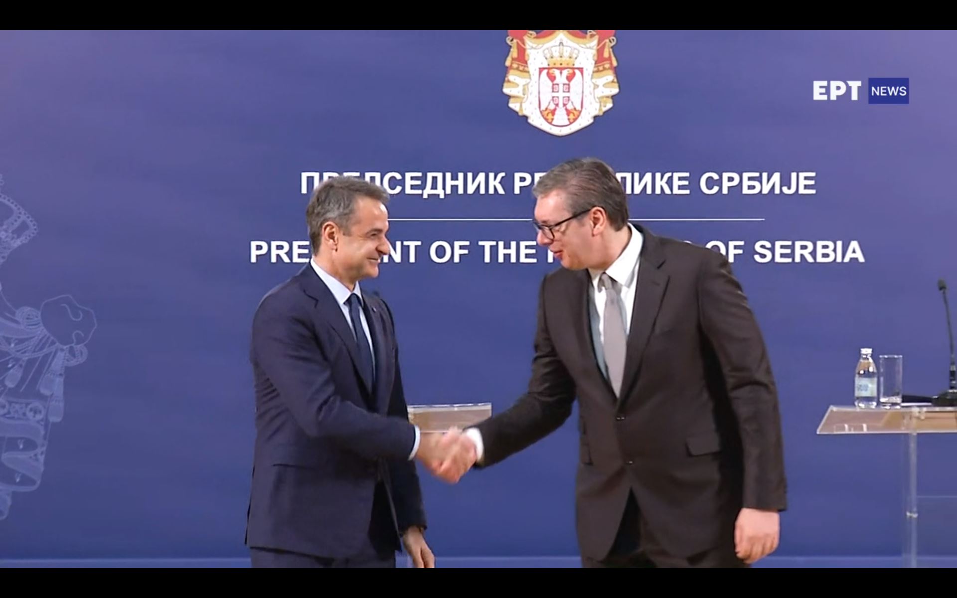 Kαι ειδικά σε ότι αφορά τη φίλη Σερβία, είμαστε έτοιμοι -και το κάνουμε ήδη- να βοηθήσουμε σε κάθε επίπεδο ώστε το συντομότερο δυνατόν να εκπληρωθούν τα απαραίτητα κριτήρια και να ενταχθεί στην Ευρωπαϊκή οικογένεια. Και όπως ανέφερα και πριν από λίγο στον Πρόεδρο Βούτσιτς, θεωρούμε ότι μία τέτοια εξέλιξη είναι αναγκαία και επείγουσα προϋπόθεση για τη σταθερότητα, την ειρήνη, τη συνεργασία, τελικά τη συνολική ευημερία στη χερσόνησό μας.