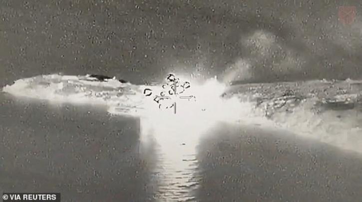 Σε βίντεο που έδωσε στη δημοσιότητα ο ουκρανικός στρατός, διακρίνεται ένα πολεμικό πλοίο κοντά σε μια αποβάθρα να έχει πληγεί από μια έκρηξη, κατόπιν να τυλίγεται στις φλόγες και ένα πυκνό σύννεφο καπνού να υψώνεται.