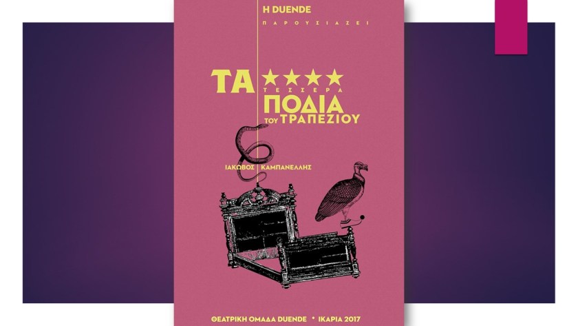 Μια εξαιρετική πολιτική αλληγορία έχει τη χαρά να παρουσιάσει η θεατρική ομάδα DUENDE στο κοινό της Ικαρίας. Πρόκειται για τα «Τέσσερα πόδια του τραπεζιού» του Ιάκωβου Καμπανέλλη. Είναι μια σάτιρα της Ελληνικής Αστικής Τάξης, γραμμένη το 1977 αλλά τόσο επίκαιρη σαν να γράφτηκε χτες.