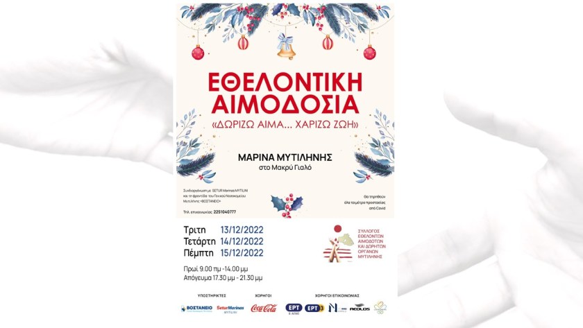 Ο Σύλλογος Εθελοντών Αιμοδοτών και Δωρητών Οργάνων Σώματος Μυτιλήνης διοργανώνει Εθελοντική Αιμοδοσία, την Τρίτη 13, Τετάρτη 14 και Πέμπτη 15 Δεκεμβρίου 2022, στη Μαρίνα Μυτιλήνης, από τις 9 το πρωί έως τις 2 το μεσημέρι και από τις 5.30 το απόγευμα έως τις 9.30 το βράδυ.