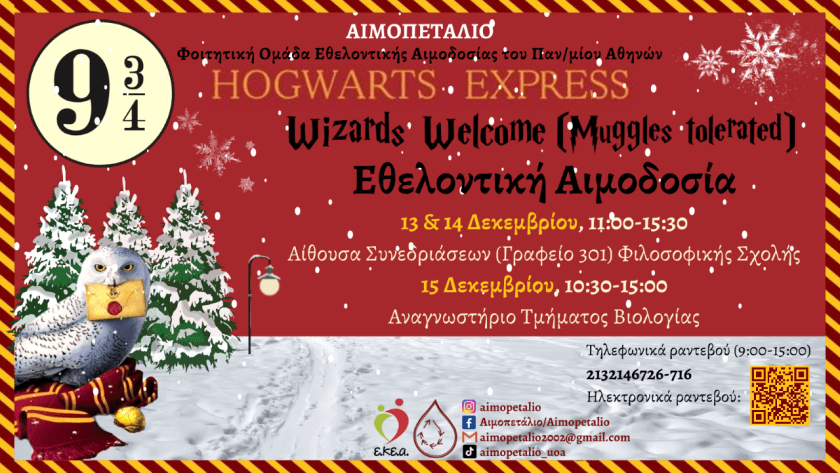 Η Χριστουγεννιάτικη εθελοντική αιμοδοσία Harry Potter του Αιμοπεταλίου θα γίνει την Τρίτη 13 και τη Τετάρτη 14 Δεκεμβρίου 2022, στην Αίθουσα συνεδριάσεων της Φιλοσοφικής Σχολής (Γραφείο 301), ώρες 11:00-15:30, καθώς και την Πέμπτη 15 Δεκεμβρίου 2022, στο Αναγνωστήριο του Τμήματος Βιολογίας, ώρες 10:30-15:00, σε συνεργασία με το Ε.ΚΕ.Α.
