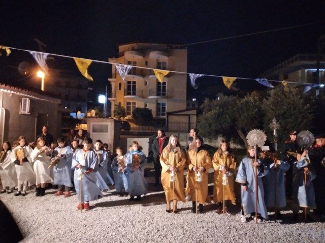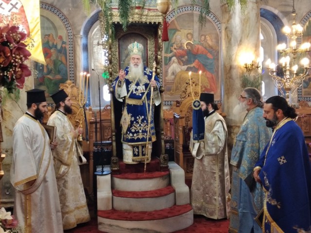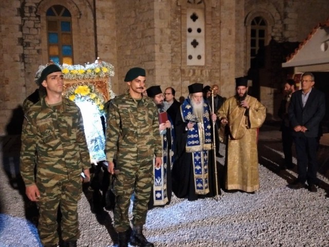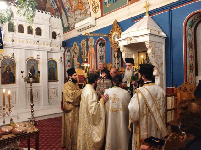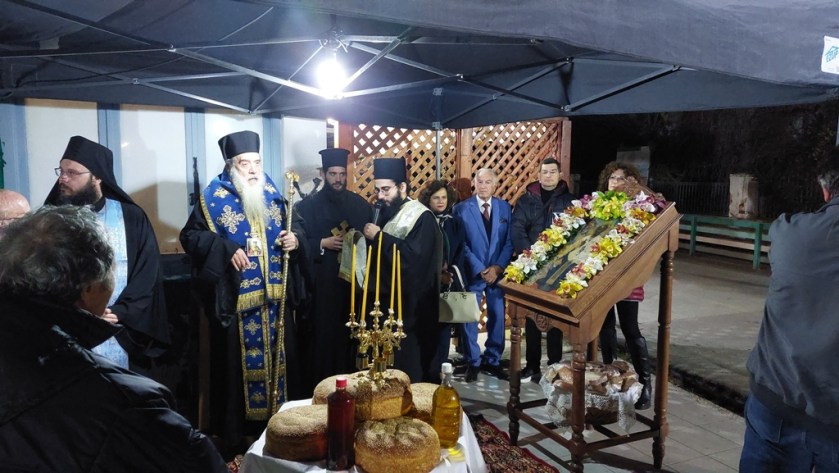 Το απόγευμα της Εορτής ο Σεβασμιώτατος Μητροπολίτης μας χοροστάτησε του Μεθεόρτου Εσπερινού υπαιθρίως έμπροσθεν του πληγέντος από το σεισμό Υπερμεγέθους Ιερού Ναού Αγίου Νικολάου Κοκκαρίου και ομίλησε επίκαιρα.