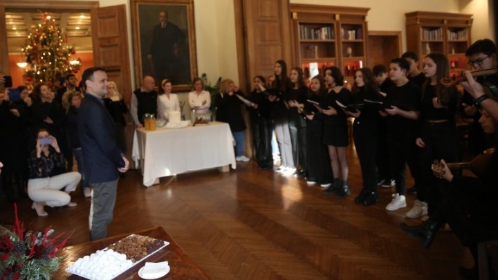 Newly sworn in Mayor of Athens Haris Doukas received traditional carol (kalanda) singers at the City Hall on Sunday.