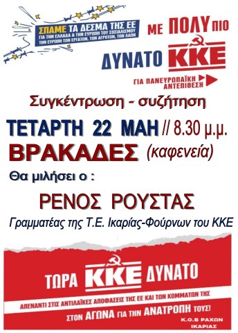 Η Κ.Ο.Β. Ραχών Ικαρίας του ΚΚΕ καλεί σε συγκέντρωση-συζήτηση ενόψει των ευρωεκλογών της 9ης Ιούνη στους Βρακάδες, με θέμα :”Δυνατό ΚΚΕ εκεί που παίρνονται οι αντιλαϊκές αποφάσεις, στο Ευρωκοινοβούλιο, και εκεί που ανατρέπονται, στους δρόμους του αγώνα!”