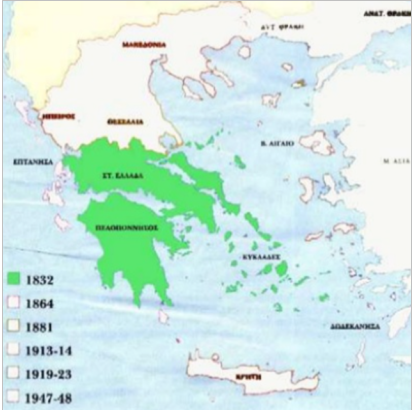 Χρειάστηκαν αγώνες που κράτησαν περίπου έναν αιώνα για να φτάσουμε στα σημερινά σύνορα. Το 1864 δόθηκαν στην χώρα αυτή τα Ιόνια νησιά ή επτάνησα, όπου κατείχαν οι Ενετοί από το 1484.