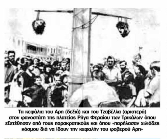 Ουσιαστικά σε εκείνο το δημοσίευμα το ΚΚΕ ήδη είχε αντιληφθεί το λάθος του και βέβαια σύντομα το σύνθημα «Ούτε ψωμί ούτε νερό στον δηλωσία «Μιζέρια» Αρη» εξαφανίστηκε. Ο θάνατός του όμως συνέπεσε με μια ασυνήθιστη διαπόμπευση, αφού τόσο το κεφάλι του όσο και το κεφάλι του συνοδοιπόρου του και επίσης αυτοκτονούντα Τζαβέλλα, εκτέθηκαν σε μια μακάβρια έκθεση σε έναν φανοστάστη της πλατείας Ρήγα Φεραίου των Τρικάλων. Οι παρακρατικοί έκοψαν τα κεφάλια των αγωνιστών τα κρέμασαν και έβαλαν τον κόσμο της πόλης να δει αυτό το αποτρόπαιο θεάμα. Η παρκάτω εικόνα προέρχεται από δημοσίευμα του βήματος της εποχής εκείνης.