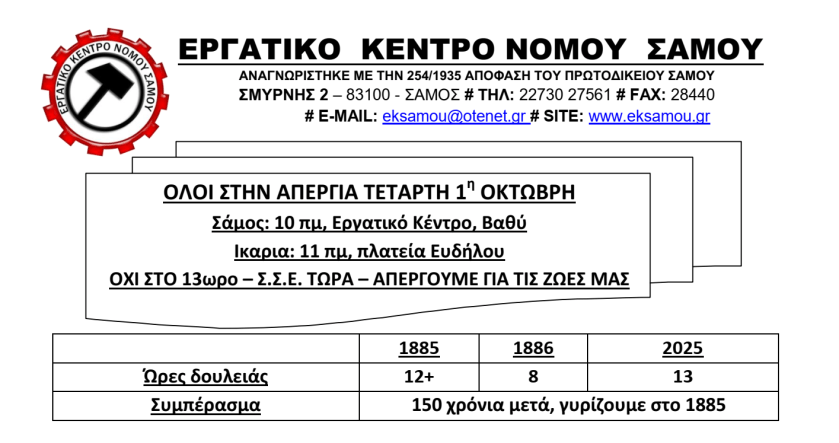 Απαιτούμε συνθήκες δουλειάς και αμοιβές που να αντιστοιχούν στις σύγχρονες ανάγκες. Η εποχή μας, η επιστημονική και τεχνολογική άνοδος, η τεχνητή νοημοσύνη το επιτρέπουν. «Ρεαλισμός» δεν είναι οι 13ώρες δουλειά αλλά η μείωση του εργάσιμου χρόνου!