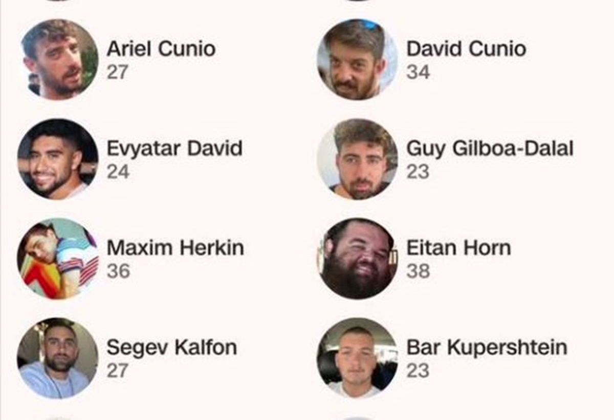 Θα απελευθερωθούν οι Matan Angrest., 21 ετών, Ziv Berman, 27 ετών, Gali Berman, 27 ετών, Elkana Bohbot, 34 ετών, Rom Braslavski, 21 ετών, Nimrod Cohen, 20 ετών, Ariel Cunio, 27 ετών, David Cunio, 34 ετών, Evyatar David, 24 ετών, Guy Gilba-Dalal, 23 ετών, Maxim Herkin, 36 ετών, Elta Horn, 38 ετών, Segev Kalfon, 27 ετών, Bar Kupershtein, 23 ετών, Omrin Miran, 47 ετών, Eitan Abraham Mor, 24 ετών, Yosef-Chaim Ohana, 24 ετών, Alon Ohel, 23 ετών, Αvinatan Or, 31 ετών και Matan Zangauker,25 ετών.