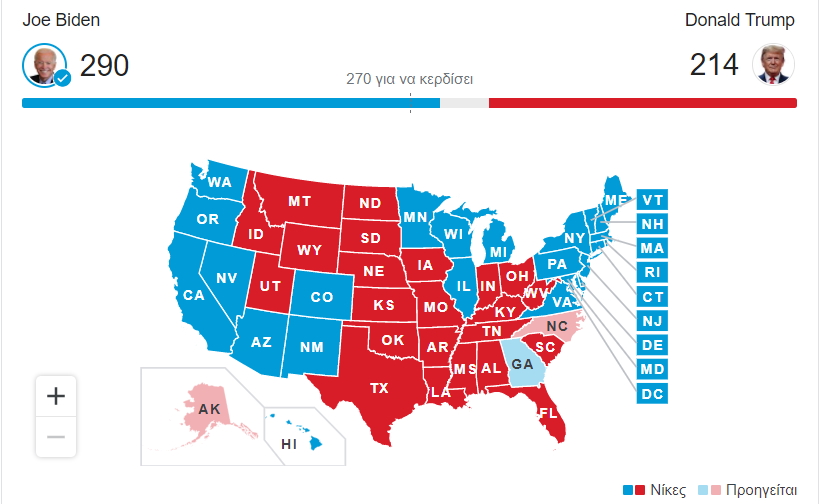 Ο 77χρονος Μπάιντεν είναι πλέον ο 46ος ένοικος του Λευκού Οίκου, εξασφαλίζοντας 290 εκλέκτορες, ενώ ο Ντόναλντ Τραμπ είναι πρώτος πρόεδρος από το 1992 που χάνει δεύτερη τετραετία.