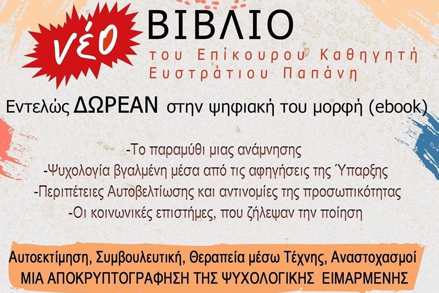 - Το νέο βιβλίο του επίκουρου καθηγητή Ευστράτιου Παπάνη (δωρεάν στην ψηφιακή του μορφή) με θέματα Ψυχολογίας, Αυτοβελτίωσης, Λογοτεχνίας, Συμβουλευτικης και Τέχνης. Το βιβλίο κοσμούν πρωτότυπες δημιουργίες εικαστικών από όλη την Ελλάδα.