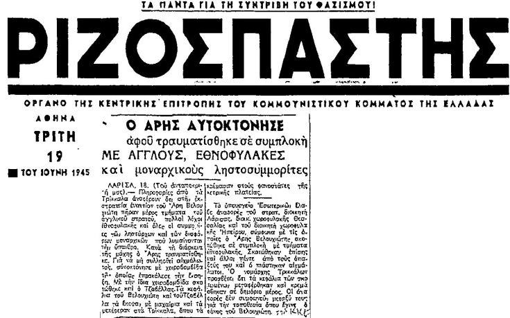 Το να διαφωνεί κάποιος εκείνη την εποχή με το Κόμμα και μάλιστα ανοιχτά ισοδυναμούσε με πολιτικό θάνατο. Στις 12 Ιουνίου του 1945 ο «Ριζοσπάστης» δημοσιεύει την αποκήρυξη του Βελουχιώτη. Την απόφαση υπογράφει ο τότε ΓΓ του Κόμματος Νίκος Ζαχαριάδης που χαρακτηρίζει την στάση του Άρη ύποπτη και τυχοδιωκτική ενώ θυμίζει πως επί δικτατορίας Μεταξά ο Βελουχιώτης ήταν «δηλωσίας». Παραμένει άγνωστο αν μέσα σε αυτές τις τρείς μέρες που μεσολαβούν μέχρι το θάνατο του Βελουχιώτη ο αρχικαπετάνιος του ΕΛΑΣ πρόλαβε να μάθει την αποκήρυξη του. Ακόμα και αν δεν πρόλαβε, όμως, είναι σίγουρο πως την… ένιωσε στο πετσί του.