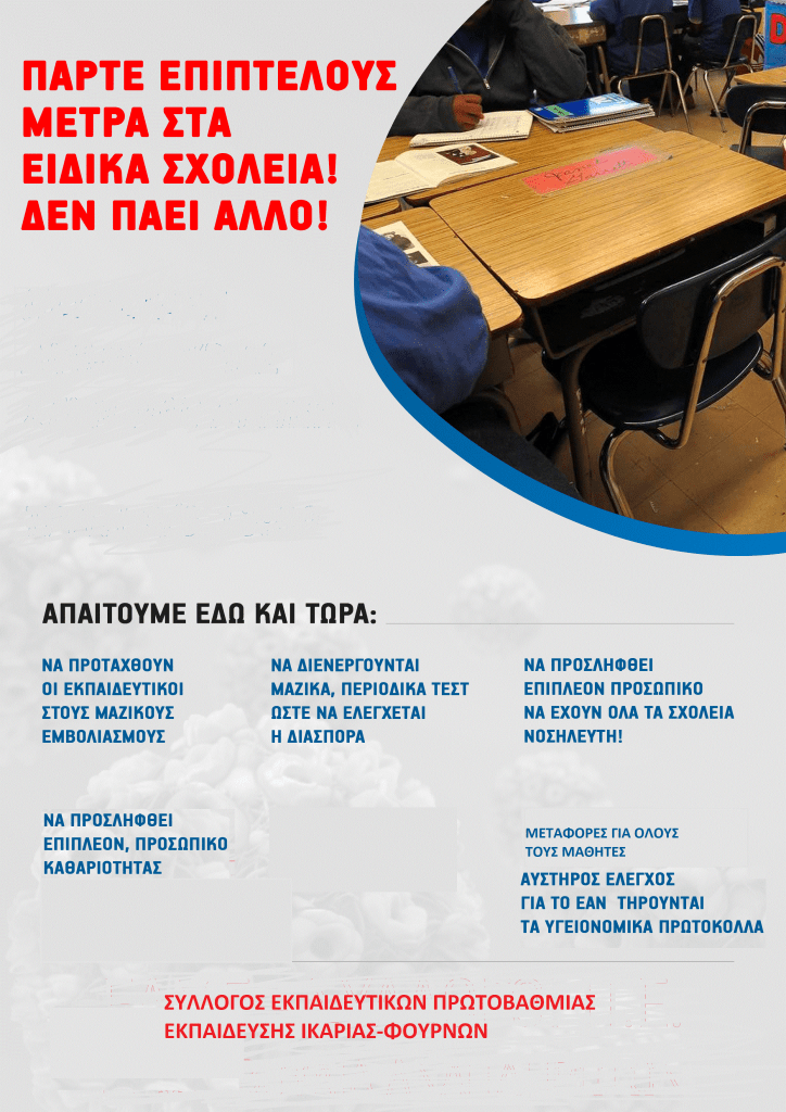 O Σύλλογος Εργαζομένων πρωτοβάθμιας Εκπαίδευσης Ικαρίας μας απέστειλε την παρακάτω αφίσα που αφορά τα ειδικά σχολεία