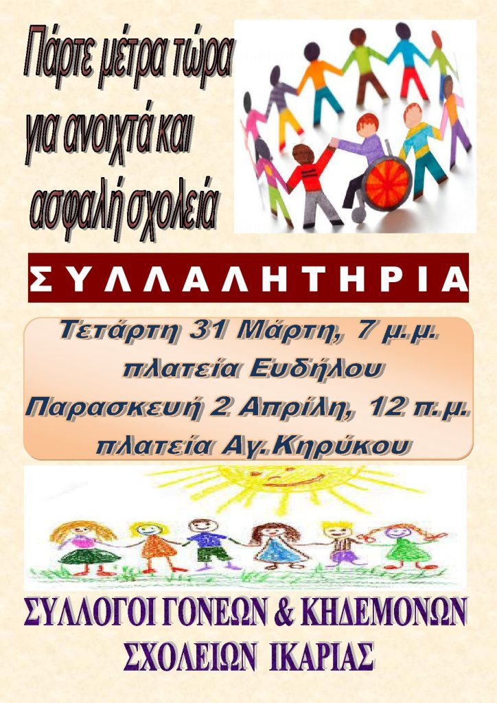 Συνεχίζουμε τον αγώνα μας και τις δράσεις μας καλώντας γονείς με τα παιδιά τους ,τους Συλλόγους Εκπαιδευτικών Πρωτοβάθμιας και Δευτεροβάθμιας Εκπαίδευσης, φορείς και εργατικά σωματεία, όλο τον ικαριακό λαό, να συμμετέχουν στα συλλαλητήρια που θα γίνουν την Τετάρτη 31 Μαρτίου στις 7 μ.μ. στην πλατεία Ευδήλου και την Παρασκευή 02 Απριλίου στις 12:00π.μ. στην πλατεία Αγίου Κηρύκου.